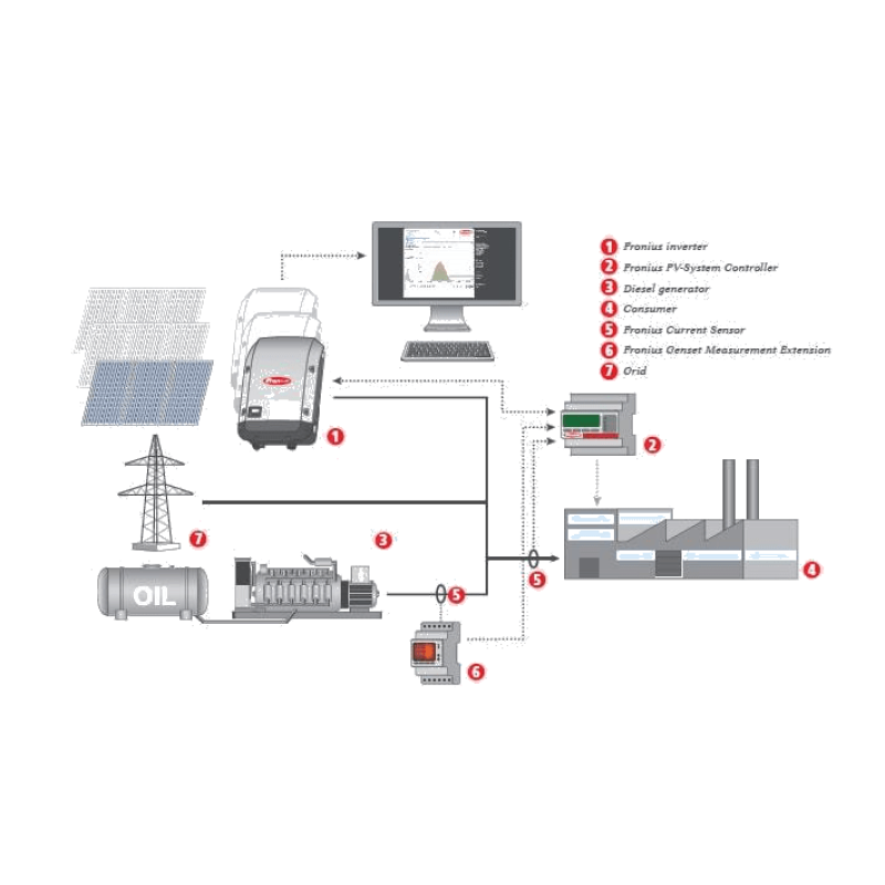 Integrarea sistemelor fotovoltaice în rețelele alimentate cu generatoare diesel necesită control rapid și fiabil al întregului sistem. Sistemul de control Fronius PV măsoară toate fluxurile de energie din sistem, permițându-i să controleze puterea PV în modul cel mai optim.