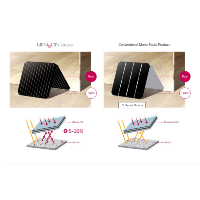 LG NeON 2 BiFacial, are celule active fata-verso si o folie translucida pe spate, ce permite utilizarea atat a luminii ce cade pe partea din fata cat si pe cea din spate, crescand astfel randamentul energetic in conditii optime, pana la 30% comparativ cu un panou monofacial cu o putere egala.