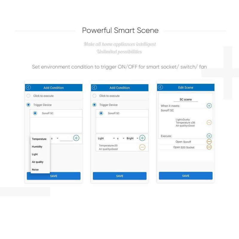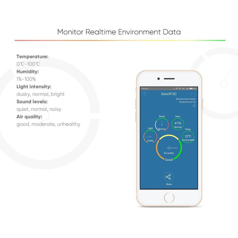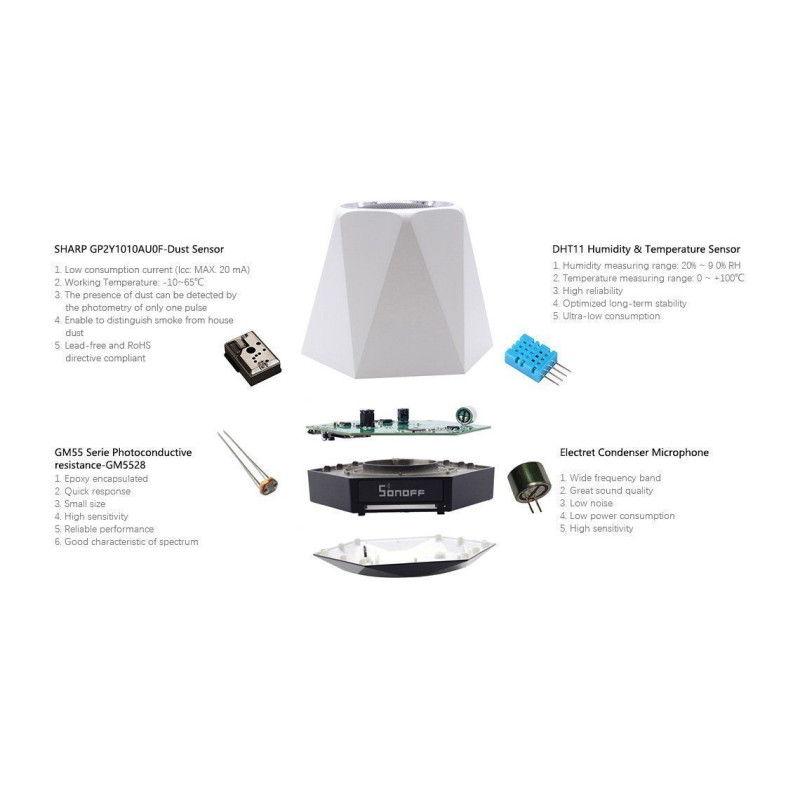 Sonoff SC este un dispozitiv de monitorizare a mediului WiFi bazat pe ESP8266. Detectează temperatura, umiditatea, intensitatea luminii, calitatea aerului (particule) și chiar nivelurile de zgomot (poluare sonoră) și trimit direct date în timp real către iOS / Android APP EWeLink.