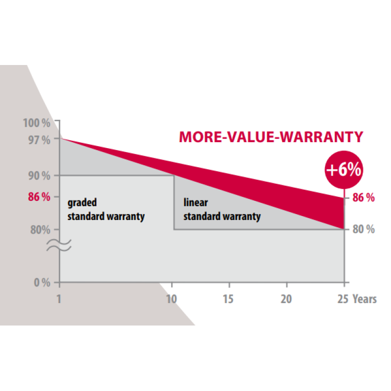 Garanția aprobată Energetica include o funcție de 12 ani,precum și o garanție extinsă de performanță la 86%, chiar și după 25 de ani.